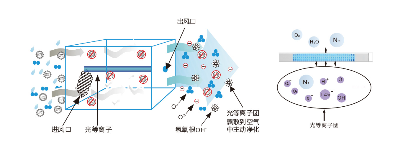 “BIOSUN百歐森”定壓環流光等離子(PHOTOPLASMA)專利技術,利用特殊材料及工藝制造的光等離子管,在特定波段下輻射能量,將光源周圍空氣中的水氣分子(H2O)、氧氣分子(O2)轉化為物質第四種形態等離子態,光等離子在空氣中主動奪取甲醛分子、揮發性有機物TVOC分子、細菌蛋白質等有害物質結構中氫(H)  元素,讓自身還原穩定,達到改變有害物質結構的目的,實現處理污染物的凈化效果。等離子團游離在空氣中,能徹底分解有害物質,還原自身成為水和二氧化碳。