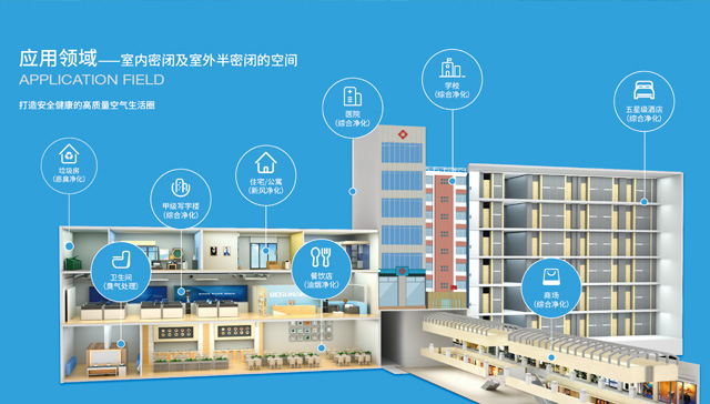 百歐森可專門針對寫字樓、商業綜合體、住宅、會展中心、學校、銀行、機場、醫院、酒店、實驗室、垃圾房等場所的空氣污染問題,主要針對密閉或半密閉的室內空間。定制智能化新風系統專屬解決方案,進行殺菌消毒、甲醛處理、PM2.5處理、垃圾房惡臭處理和油煙凈化處理,有效控制化學污染、生物污染和二氧化碳超標等問題。