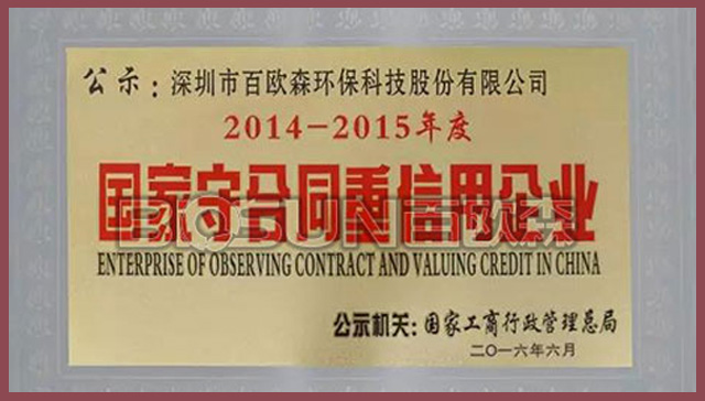 榮譽是對過去的肯定,而奮斗與發展才是永恒的主題。百歐森將繼續突破創新、卓越前行。不忘初心,為環保事業,奉獻力量,守護拼搏!“守合同、重信用”已成為企業在市場競爭中不可或缺的重要品質之一,是企業生存發展之本、開拓創新之基。